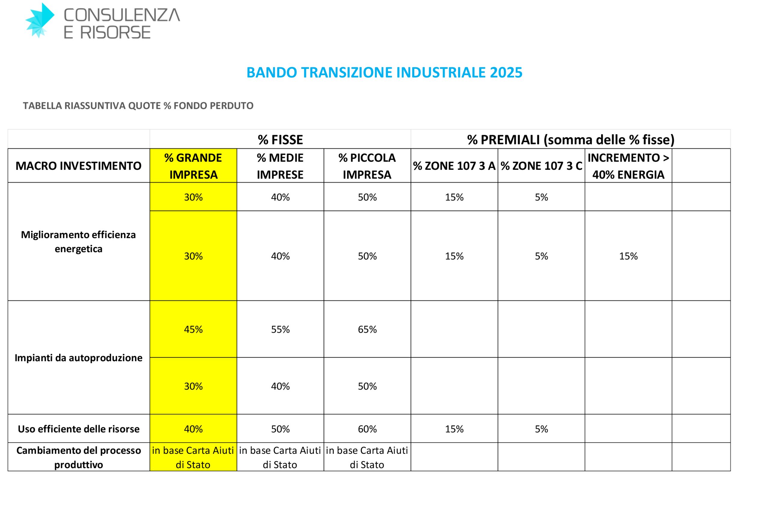 Abbiamo predisposto una Scheda riepilogativa del Bando Transizione Industriale e uno Schema Sintetico (vedi immagine) delle percentuali delle quote a fondo perduto ottenibili a seconda dei diversi parametri.